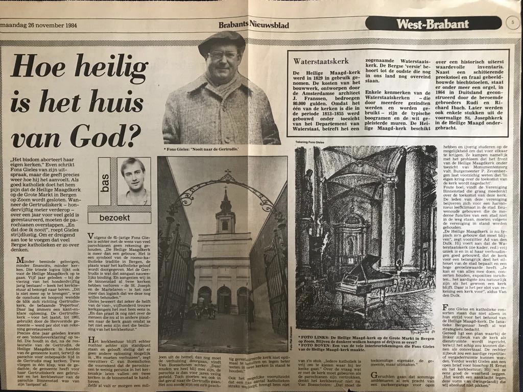 Fons Gieles streed vaak op geheel eigen wijze, veelal door ingezonden stukken in de krant. Het onderschrift F.G. was al snel genoeg voor iedere Bergenaar om te weten uit welke pen het kwam. Maar bij ingezonden stukken bleef het niet: als hij het nodig vond werd er meer actie ondernomen. Zo regelde hij een ‘second opinion’ via de Landbouw Universiteit van Wageningen voor de vaststelling van de toestand van de bomen aan het Bolwerk. Het heeft ze voor de kap behoed.