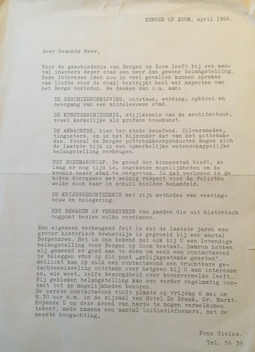 Uitnodigingsbrief die Fons Gieles in april 1966 stuurde aan Bergenaren geinteresseerd in historie en cultuur van de stad. Een mede aanzet tot de stichting van de Geschiedkundige Kring die officieel werd opgericht op 26 januari 1968.