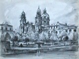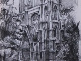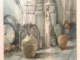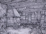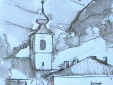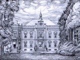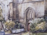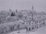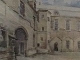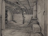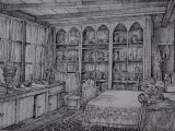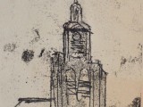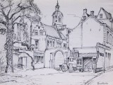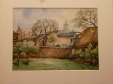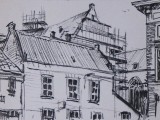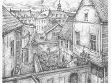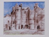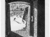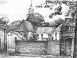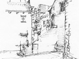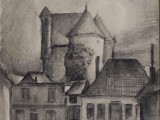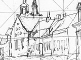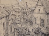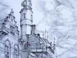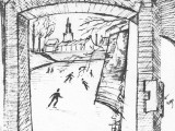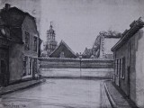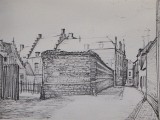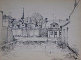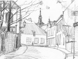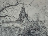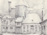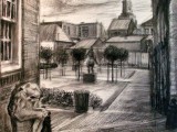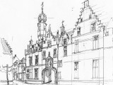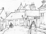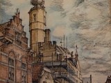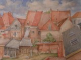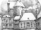 Zicht vanuit hoekkamer Vismarkt op Markiezenhof. Voorstudie voor de nieuwjaarswens van 1988.