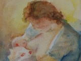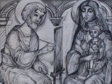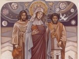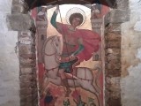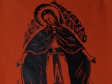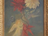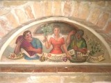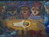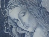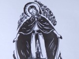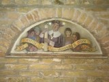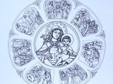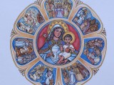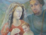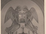 Twee engelen dragen het portret van Maria met knidje Jezus. Foto van een muurschildering in de (inmiddels gesloten) kerk van Dinteloord.