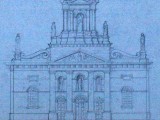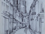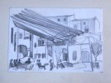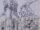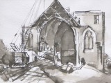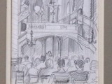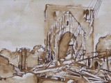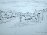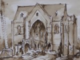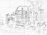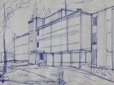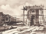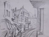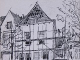 Schets van de Peperbus in de steigers vanuit Zuivelpleintje