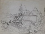 Zicht op sloop achter het stadhuis te Bergen op Zoom juni 1975. Is mogelijk gemaakt met het idee van voorstudie gezien de woorden die in diverse delen van de tekening zijn geschreven.