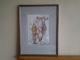Detail van een illustratie bij het gedicht 'Ballade van dweilmaandag' van Kees Hagenaars in de carnavalskrant van 1983. Fons Gieles maakte vaker kopieen van eigen werk om die vervolgens voor andere gelegenheden speciaal in te kleuren. Zo ook bij deze afbeelding: gebruikt als gelukwens door dhr en mevr Huesman bij de geboorte van Guy Drop.