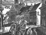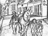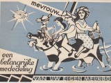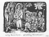 "Kinderen verkleed als Drie Koningen bij de Geweldigerstraat ter hoogte van ""Wed. Dietvorst"". Volgens een andere schets zou de tekst eronder luiden: ""Handel in koloniale waren. Boter, kaas, vet en spek. Alle soorten visch. Alle soorten klompen kappen. En riemen voor klompen."" Gebruikt als nieuwjaarswens 1975"