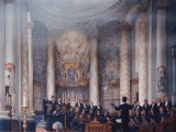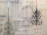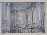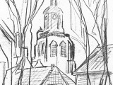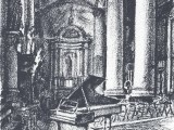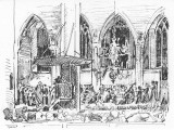 Schets van interieur van de Gertrudiskerk met kroonluchters en zicht op orgel