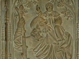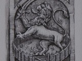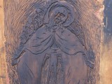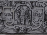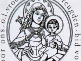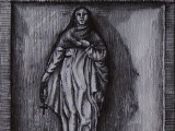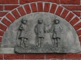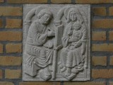 Foto van de gevelsteen Cornelis Pronkstraat 20 te Bergen op Zoom, lang het woonhuis van Fons Gieles. Links St. Lucas, patroonheilige van de schilders, rechts Maria met kinje Jezus.