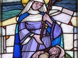 Het wijnflesetiket met St Gertrudis, ingekleurde versie. De opbrengst van de wijn verkoop was bedoeld voor de financiering van de Gertrudiskapel. Opschrift: "Ste Gertudis 623 - 659 Beschermvrouwe van alle die zich op reis gaan begeven. Vanouds deed men dan een heildronk (toast) en sprak daarbij de wens: Op Sinte Geertens Minne...ende vaert wel!"
