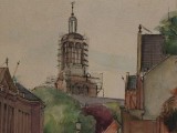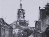 De toren van het Markiezenhof gezien vanuit de Steenbergsestraat. Een deel van de voorgevel van het Markiezenhof staat in de steigers. Gemaakt in 1980, gebruikt als nieuwjaarswens 1981. Er is ook een ingekleurde versie (nr 804).