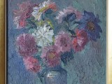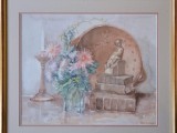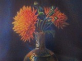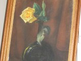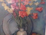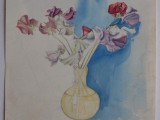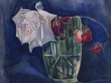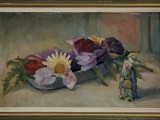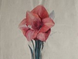 Stilleven van ronde glazen vaas met rode dahlia. Vermoedelijk uit zelfde periode als de gele roos (ID 582): eerste helft jaren '40.
