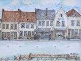 Zicht op 13 gevels van de Vismarkt te Bergen op Zoom, voorzien van de namen die de panden bewoonden of er een winkeltje/cafe hadden.