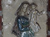 Madonna met kindje Jezus in een bijzondere uitvoering: een tegel van geglazuurde keramiek.