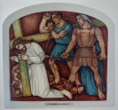 Statie III. 'Jezus' eerste val onder het kruis'. De kruisweg was een opdracht van de Broeders van Huijbergen voor de Kweekschool te Breda. Hij werd gemaakt in de periode 1954 - 1956.
